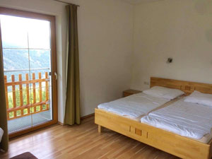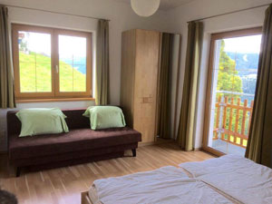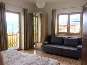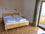 Ebben a légtérben van egy kinyitható kanapé (mérete: 145x210 cm), az étkezőgarnitúra, komód, TV, innen nyílik a zuhanyzóval, mosdóval, WC-vel felszerelt fürdőszoba, majd a franciaerkélyes nagyméretű hálószoba.
